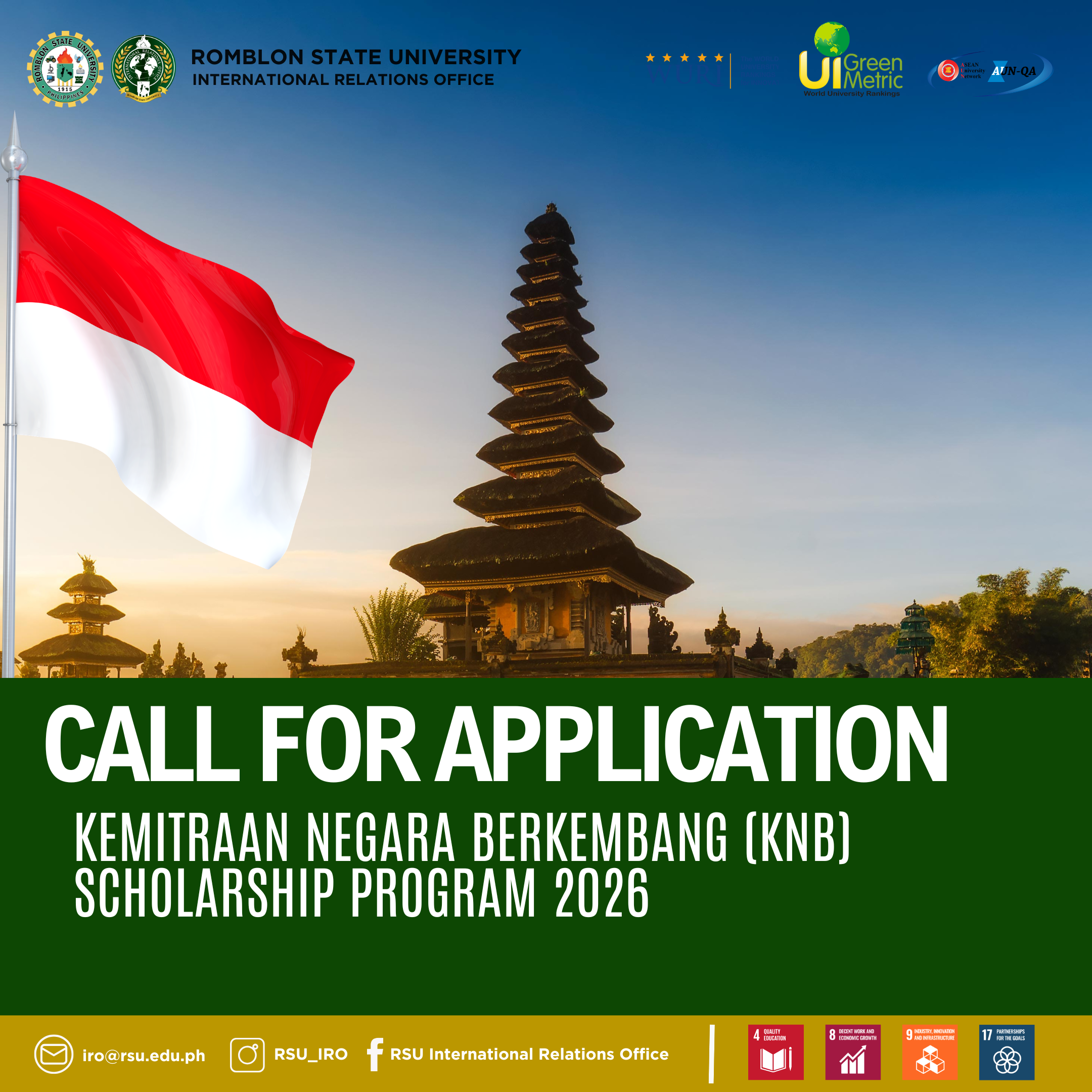 The Kemitraan Negara Berkembang (KNB) Scholarship Program 2026 is now open, offering fully funded opportunities for international students from developing countries, including the Philippines, to pursue higher education in 47 host universities across Indonesia. Applications are accepted until 31 March 2026, and interested applicants are encouraged to review the official guidelines and apply. RSUvians are highly encouraged to take advantage of this international academic opportunity.