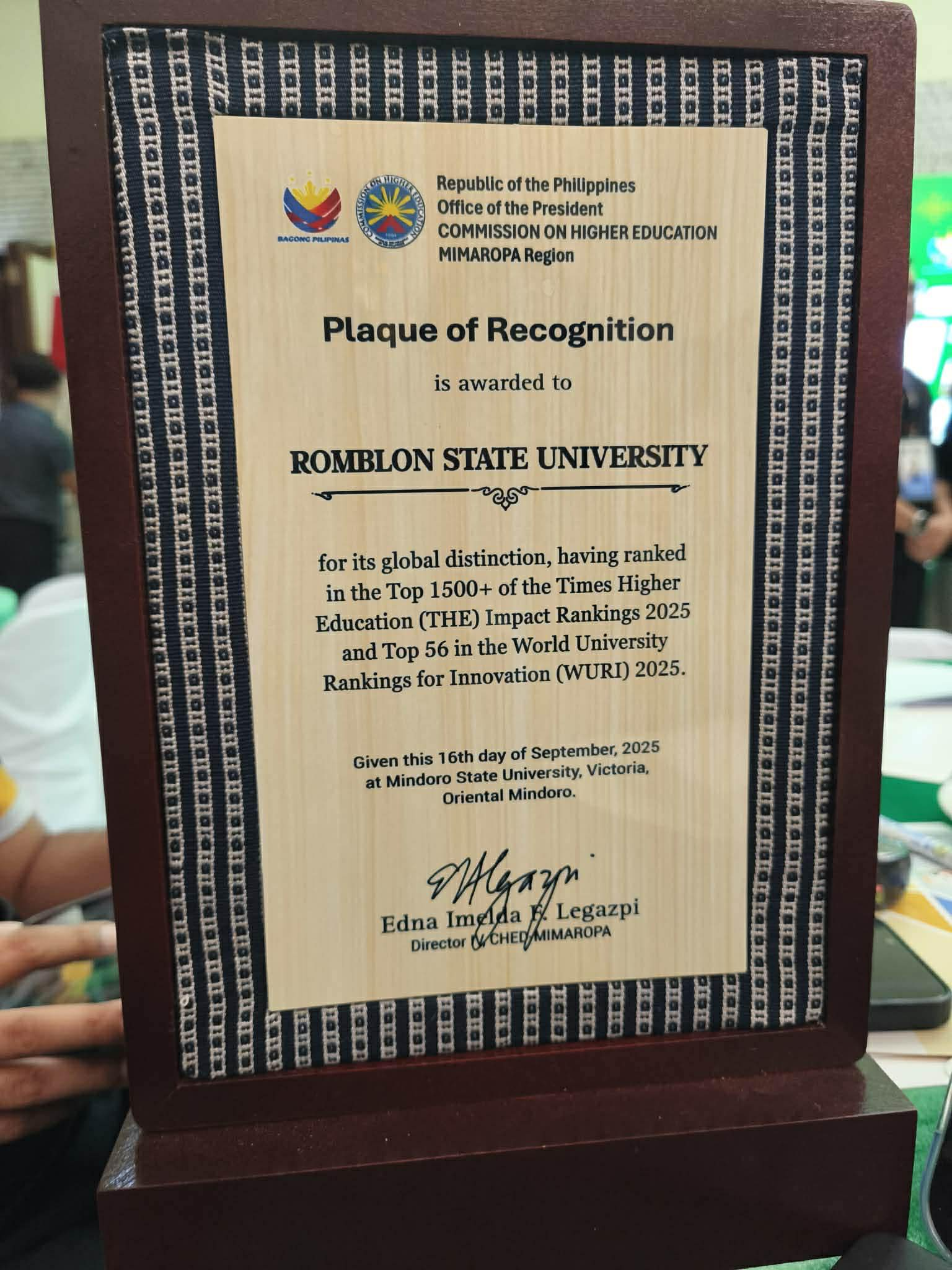 Romblon State University continues to strengthen its position in the global academic landscape after receiving a Plaque of Recognition from the Commission on Higher Education (CHED) MIMAROPA Region, acknowledging its outstanding performance in international university rankings.