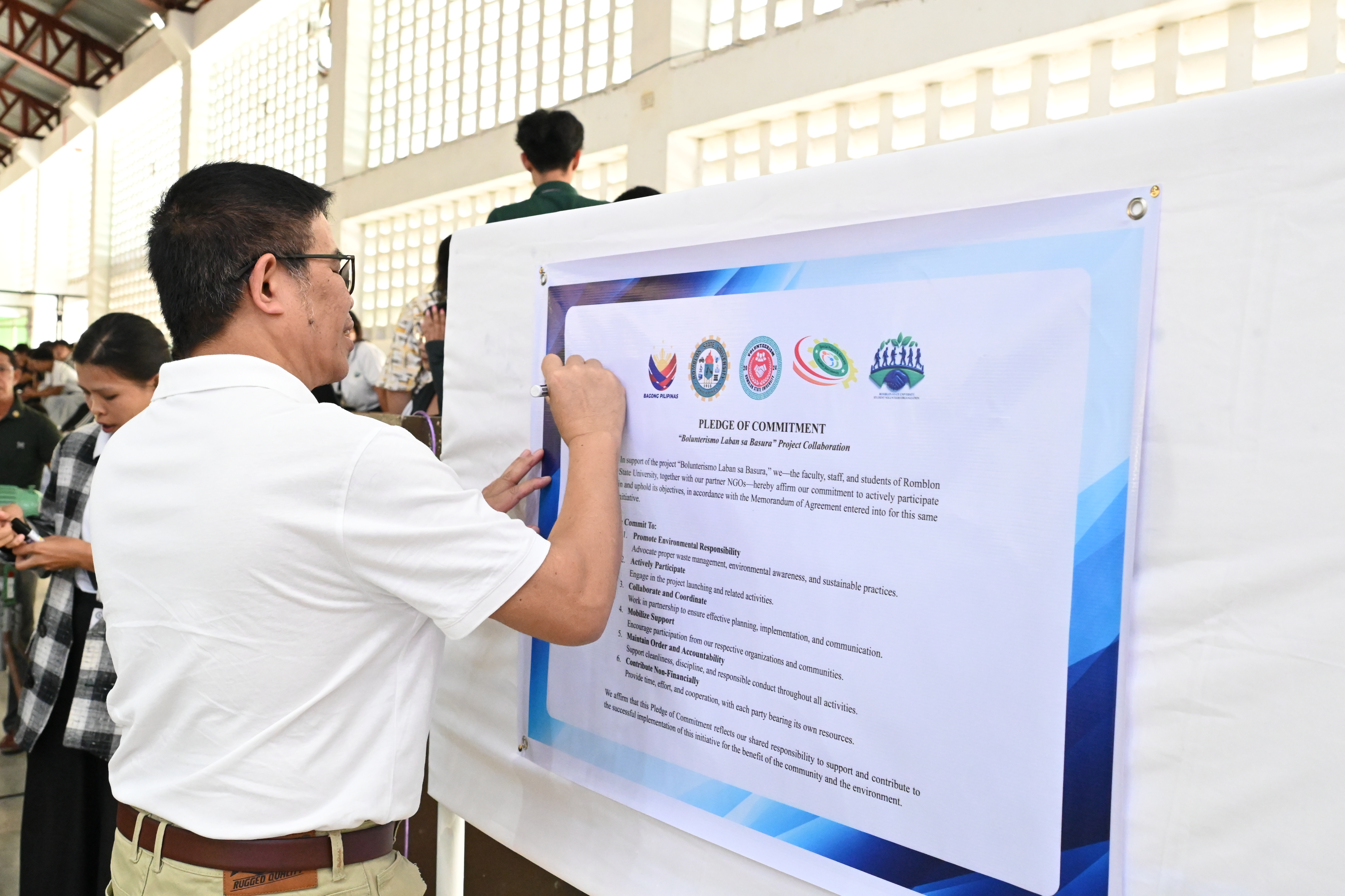 The RSU community, together with partner NGOs and agencies, comes together for the ceremonial signing of the Pledge of Commitment and Memorandum of Agreement in support of the collaborative project, Bolunterismo Laban sa Basura.