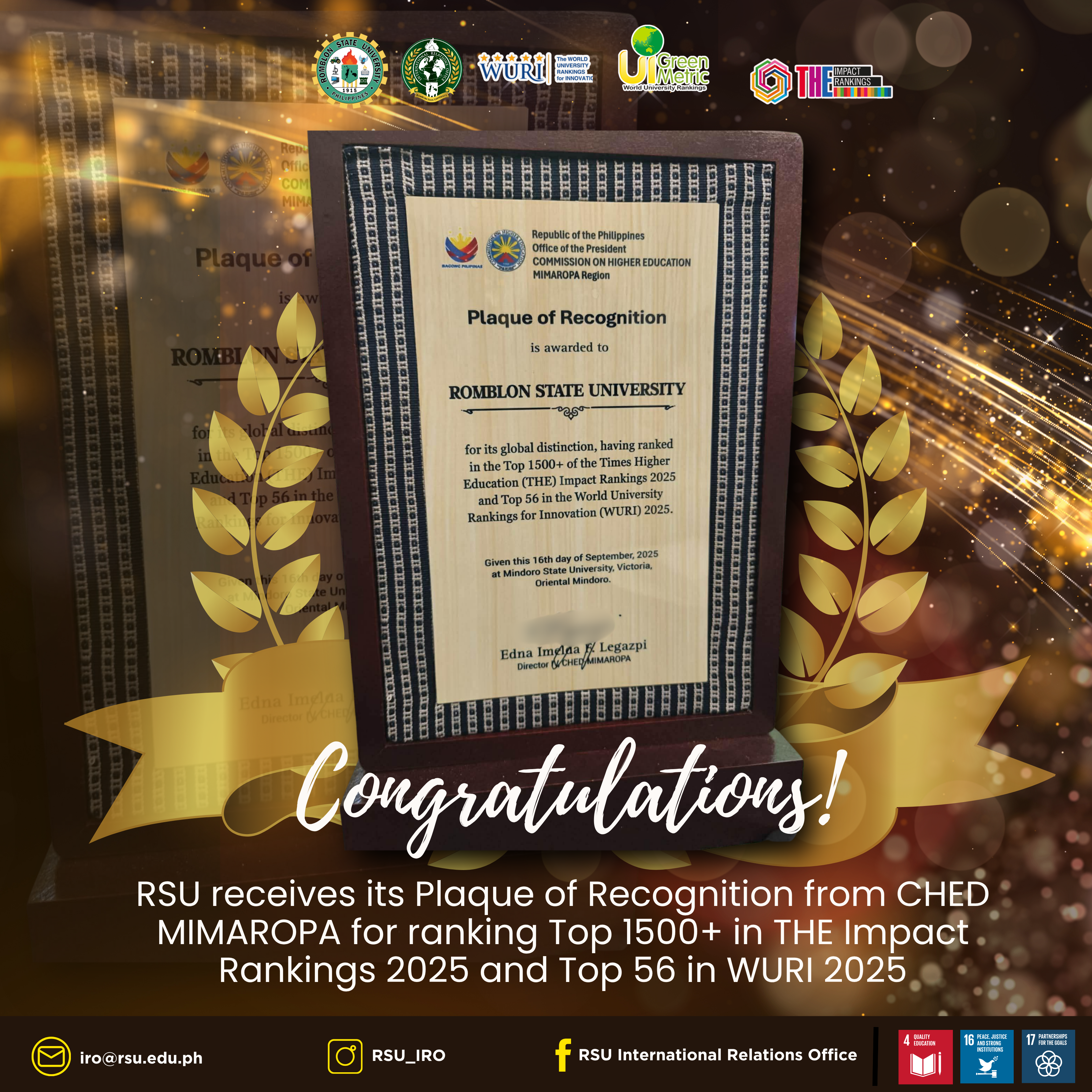The recognition was formally conferred on September 16, 2025, at Mindoro State University in Victoria, Oriental Mindoro. It highlights RSU’s remarkable achievement of being ranked among the Top 1500+ universities worldwide in the Times Higher Education (THE) Impact Rankings 2025 and securing a spot in the Top 56 institutions globally in the World University Rankings for Innovation (WURI) 2025.