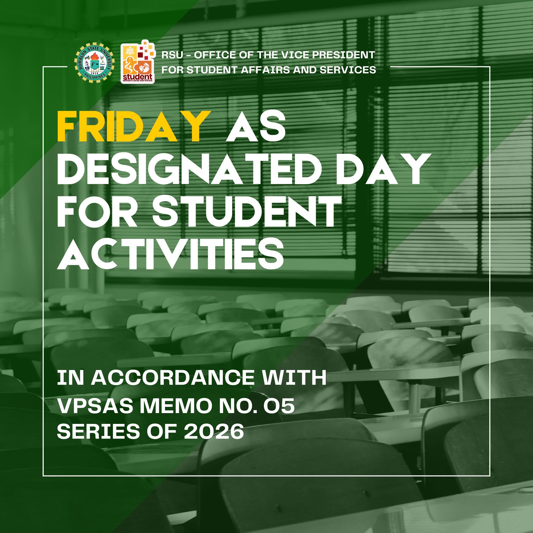 Romblon State University has officially designated Fridays as Student Organization Activities Day across all campuses, in line with VPSAS Memorandum No. 5, series of 2026. The initiative aims to strengthen student leadership, engagement, and holistic development by providing a regular, protected time for student-led initiatives.